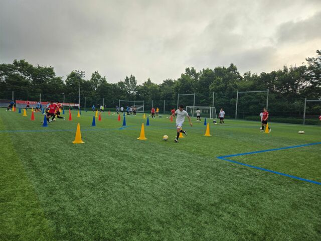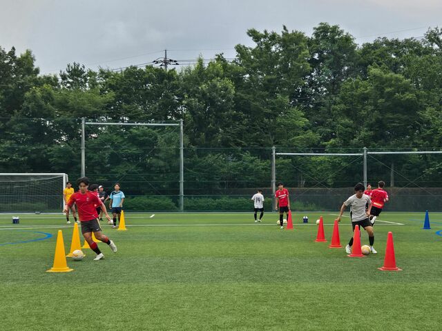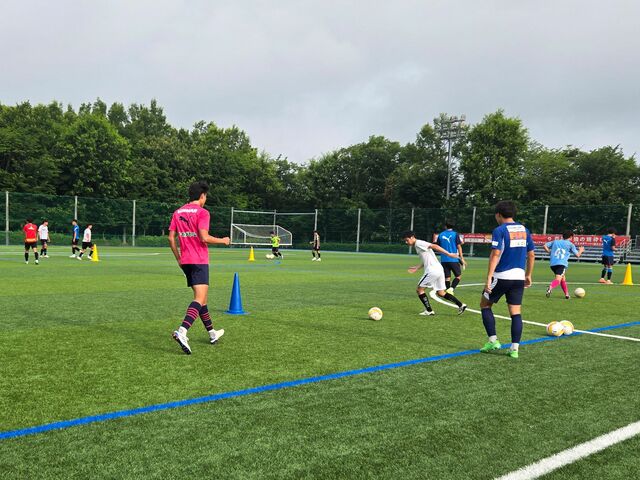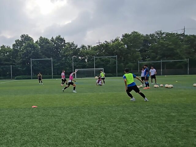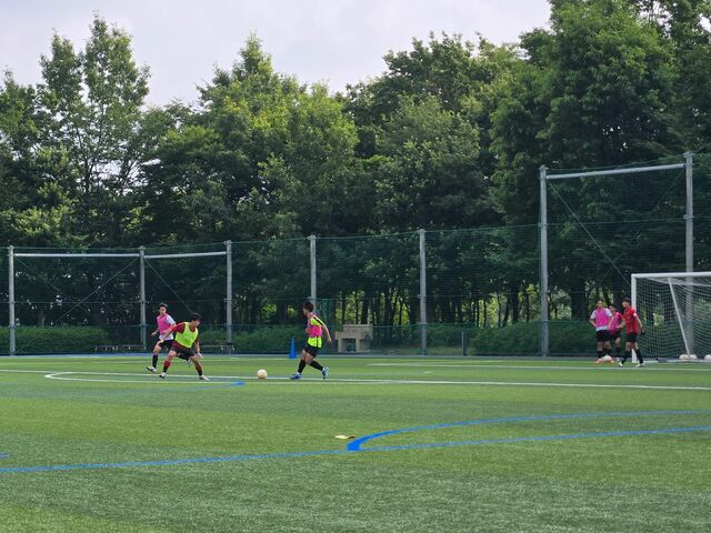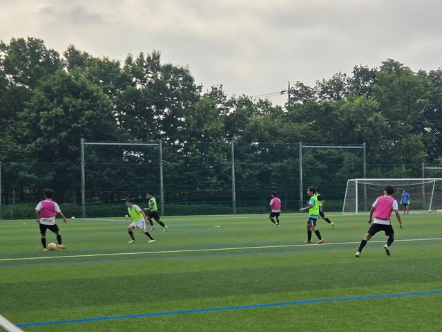 ウォーミングアップの様々なドリブルを用いたサーキットトレーニングやパスコン(パス&コントロールの略。四角形をコーンで作ってパスアンドゴーをしていきます)から既にしんどい。なんせ少人数で回転が速く、トラップのズレ一つ(右足の前に止める、左足の前に止める、とかそれくらいのレベルのズレでも)も浮いてしまう。それを高速でやっていきます。