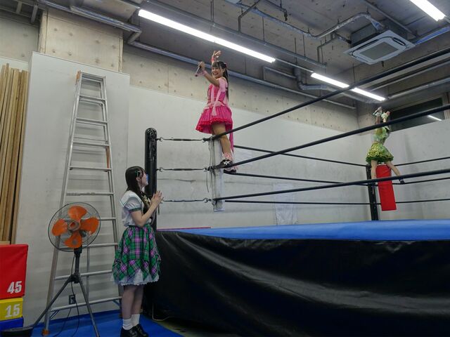 開催に先駆けて、マレーシアからKLP48のメンバー・山根涼羽が緊急来日し、東京女子プロレスの道場を訪問。というのも、イベント当日はリングの上でライブパフォーマンスをすることになるため、とにかくリングの上に立ってもらい、感覚を掴んでもらおう、という趣向。はじめてリングを目の当たりにした、という山根は興奮気味だったが、リングでのパフォーマンスについては“えっ、そうなんですか? 今、はじめて聞きました”と困惑気味。