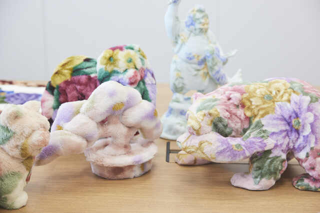 江頭:この中は、リサイクルショップでもオブジェを探してきたワンちゃんの陶器です。僕、リサイクルショップを巡るのが大好きで、使い古されたものにすごく興味があるので、暇さえあればリサイクルショップに行ってオブジェを買ったりしています。最初は作品のために買ったオブジェでも、どんどん愛着が湧いて毛布を貼れなくなっちゃうんですよね。可愛すぎて貼れないと思って、同じようなのを探してそっちに貼るみたいなこともやったりします。